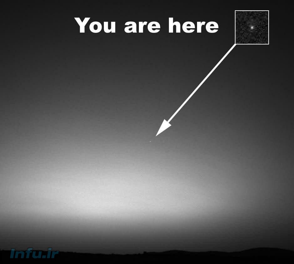این عکس را مریخ نورد اسپیریت یک ساعت قبل از طلوع آفتاب مریخ گرفته است. « آن نقطه کمرنگ در وسط تصویر “ما” هستیم – همه ی ما »