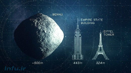 مقایسه ابعادی طرح شبیه‌سازی‌شده‌ای از سیارک بنو با ساختمان امپایر-استیت و برج ایفل