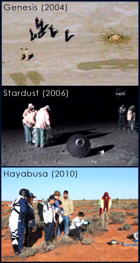 بازیابی محموله‌های حاوی تنها نمونه‌برداری‌های بین‌سیاره‌ای تاریخ، در پایان مأموریت‌های فضایی جنسیس (در صحرای یوتا)، استارداست (در صحرای یوتا)، و هایابوسا (در صحرای وومرای استرالیا). (کپسول حاوی نمونه‌های جنسیس متأسفانه در پی عملکرد ناقص چتر نجات، برخورد شدیدی را به زمین تجربه کرد؛ هرچند که بخشی از نمونه‌ها بعدها در آزمایشگاهْ بازیابی شد).