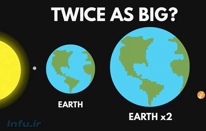 اگر شعاع زمین دو برابر شود، از آنجایی که حجم کره از فرمول ۴/۳Πr³ به دست می آید و چگالی زمین ثابت است، جرم زمین هشت برابر می شود. بنابراین بر اساس فرمول نیروی گرانشی [G.M.M’/R²] جاذبه ی زمین ۲ برابر می شود. یعنی این که وزن هر جسمی بر روی زمین دو برابر می شود. در چنین شرایطی بیشتر موجودات زنده ی کره زمین از جمله انسان ها، به خاطر وزن زیاد خود متلاشی می شوند و موجودات تازه ای که با شرایط سازگاری دارند به وجود می آیند. البته ممکن است درختانی که بلند و کلفت هستند باز هم رشد کنند ولی نیاز به ساختار محکم تری دارند. حیوانات هم باید پاهای قوی تری داشته باشند که بتوانند وزن دو برابر خود را تحمل کنند. البته امکان ندارد که جاذبه ی زمین به طور ناگهانی دوبرابر شود!