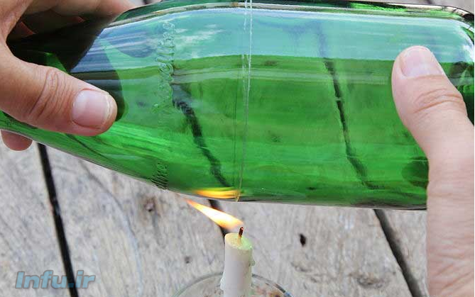 4 – توسط یک شمع ، قسمت خط دار بطری را که توسط الماس شیار خورده است ، گرم کنید . این کار باعث می شود تا بطری راحت تر نصف شود