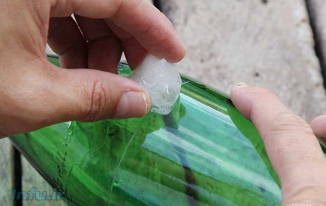 5 – بلافاصله ، با مقداری یخ محل شیار خورده را که با شمع گرم کرده بودید ، خنک نمایید . این کار را چند مرتبه انجام دهید و سپس بطری را داخل یک پارچه قرار دهید و به قسمت شیار داد ضربه وارد نمایید . با این کار بطری به دو قسمت تقسیم می شود .