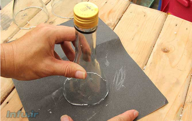 7 – در این مرحله به کمک سمباته سخت ، لبه های تیز بطری را صاف کنید تا مانع از بریدن دستان در هنگام کار با آن ها شود