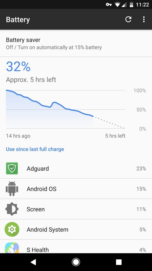 یکی از اپلیکیشن هایی که شاید هم اکنون شما برای حذف تبلیغات به ذهن آورده اید Adguard است. این برنامه هم به شما کمک می کند که تبلیغات اپ ها را حذف کنید اما با کاهش شدید عمر باتری مواجه خواهید بود. ما برای تست Adguard را هم روی سیستم نصب کردیم، و در ۵ ساعت به صورت زیر شاهد کاهش باتری به صورت زیر بودیم:
