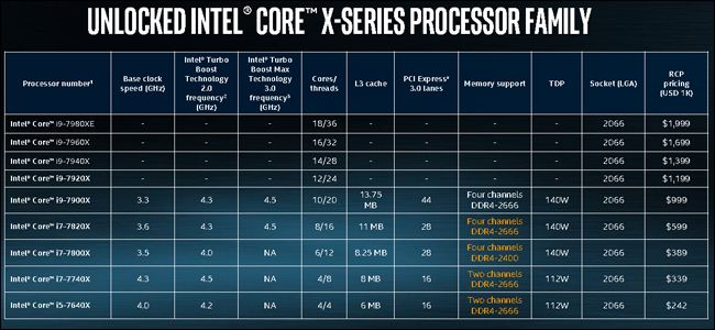 اینفو – این سری از سیپییوهای اینتل از سوکت جدیدی تحت عنوان LGA2066 استفاده می کنند که این موضوع به معنای ارتقای اجباری مادربرد و تعویض آن با یک مدل سازگار با سیپییوی جدید است.