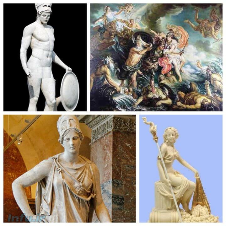 | آتنا (خدای عقل، خرد و فرزانگی)آتنا از مغز زئوس زاده شده است. | مینرو |