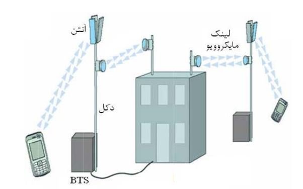 در شکل زیر مشخص شده است که در یک ایستگاه پایه آنتنها که در بالای دکل نصب میشوند، تابشهای رادیویی را به محیط ارسال میکنند. دو نوع آنتن روی هر دکل قرار دارد؛ یک نوع آنتن مربوط به ارسال و دریافت تابش در فرکانسهای GSM است. این آنتنها با گوشیهای تلفن همراه ارتباط برقرار میکنند تا امکان تماس گرفتن با هم توسط گوشی فراهم شود.