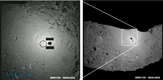 سایه فضاپیمای ژاپنی هایابوسا بر سطح سیارک ایتوکاوا، حین نزدیک شدن جهت نمونه‌برداری (در ۱۹ نوامبر ۲۰۰۵). نقطه درخشانی که در تصویر سمت چپ با دایره نشان داده شده، محل برخورد یک گوی کوچک فلزی به سطح سیارک است، که به‌منظور نشانه‌‌گذاری محل نمونه‌برداری به سمت سطح سیارک شلیک شد (این گوی، حاوی اسامی ۸۸۰ هزار فرد علاقه‌مند از ۱۴۹ کشور بود).