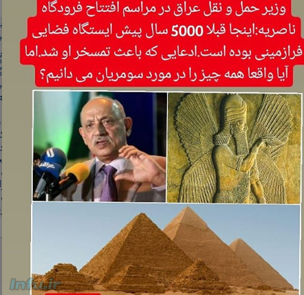 چندی پیش در جریان افتتاح فرودگاه دیغار ،وزیر حمل و نقل عراق بنام کاظم فینجان،اظهارت عجیبی مطرح ساخت که موجب تعجب گردید. او در طی سخنرانی اش در جمع حضار ادعا نمود که این منطقه یعنی عراق و خاورمیانه ،زمانی ایستگاه فضایی فرازمینی ها بوده است. فینجان در تایید مدعایش به نوشته های ذکریا سیچن ،باستان شناس و مولف مشهور روسی اشاره کرد . او اضافه کرد در کتاب سیچن بنام “تاریخ از سومر شروع می شود” نوشته شده اولین فرودگاه بشر در ناصریه عراق توسط سومریان با کمک فرازمینی ها دایر شد. علت انتخاب ناصریه برای این امر این بود که ناصریه ایده ال ترین و امن ترین مکان برای فرود و پرواز بوده و بهترین شرایط اب و هوایی را برای این هدف دارد.اما به محض اینکه سخنرانی اش تمام شد رسانه های عراق شروع به مسخره کردن اظهاراتش نمودند و برخی او را توهم زده و ناقص العقل خواندند.