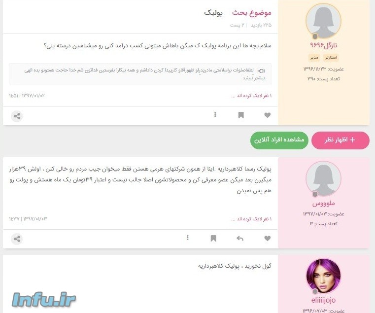 پولیک رسما کلاهبرداریه. اینا از همون شرکتهای هرمی هستن فقط میخوان جیب مردم رو خالی کنن ، اولش ۳۹هزار میگیرن بعد میگن عضو معرفی کن و محصولاتشون اصلا جالب نیست و اعتبار ۳۹ تومان یک ماه هستش و پولت رو هم پس نمیدن.