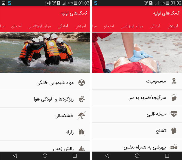 آموزش کمکهای اولیه: تب اول برنامه مربوط به کمکهای اولیه در زمان مواجه شدن با حوادث مختلفی همچون خونریزی، شکستگی و… است که هر کدام بهصورت مجزا در یک لیست در اختیار شما قرار گرفتهاند. با ورود به هر کدام، به توضیحات فارسی و دستهبندی شدهی روش برخورد با آن حادثه دسترسی خواهید داشت. علاوه بر توضیحات فارسی که در تمام حادثهها وجود دارد، یک ویدیوی فارسی نیز در برخی از آنها قرار داده شده است که میتوانید با تماشای آن، بهطور کامل با نحوهی مدیریت آن حادثه آشنا شوید. در بعضی از حوادث نیز بخشی با عنوان سؤالات متداول وجود دارد که در آن به پرسشهای احتمالی در رابطه با حادثه یا روش کمک آموزشی، پاسخ داده شده است تا کاربر بهطور کامل متوجه روش آموزش داده بشود.