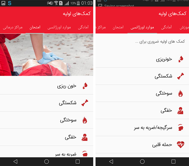موارد اورژانسی: در تب سوم که موارد اورژانسی نام دارد، به راهکارهای سریع و خلاصه شدهای برای مواجه شدن با فرد مصدوم دسترسی پیدا خواهید کرد. اگر فرصت نکردهاید مطالب آموزشی این اپلیکیشن را بخوانید یا اگر در زمان بروز حادثه به دلیل استرس هر آنچه خواندهاید، فراموش کردید، میتوانید با مراجعهی سریع به این بخش، از کارهایی که باید انجام دهید آگاه شوید.