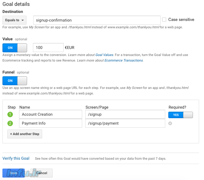 اگر یک فرآیند چند مرحله ای برای تبدیل کاربران در نظر گرفته اید، از بخش funnel استفاده کنید. URLهای مورد نظرتان را وارد کنید. شما می توانید با انتخاب و ویرایش تنظیمات، نوع گزارشی که به شما داده می شود را تعیین کنید.