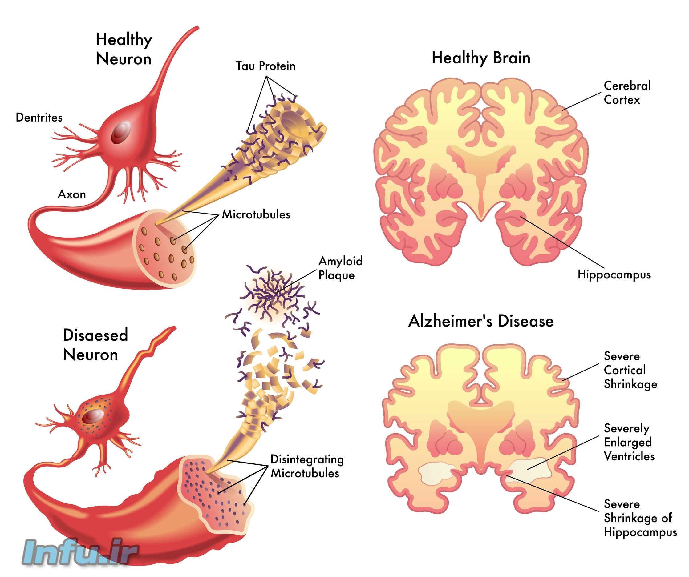 اما در بیماری آلزایمر و به دلایلی که هنوز به صورت کامل آشکار نیست پروتئینی به نام «بتا آمیلوئید» در سطح خارجی نورونها تجمع میکند و پروتئین دیگری تحت عنوان «تاو (Tau)» در سطح داخلی نورونهای عصبی فرمهای غیرطبیعی کلافیشکل ایجاد میکند.
