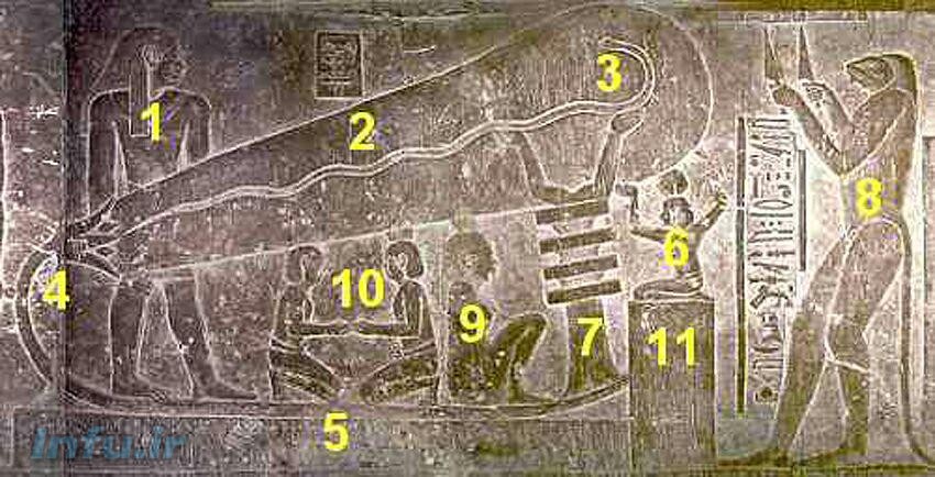 لامپ مصری با رشته سیمی داخلش، شماره هفت سه شاخه اتصال فنرها مثل لامپ های امروزی، متصل به رشته سیم دیده می شود،ما که دقیقا لامپ می بینیم،چه چیز دیگری میتونه باشه