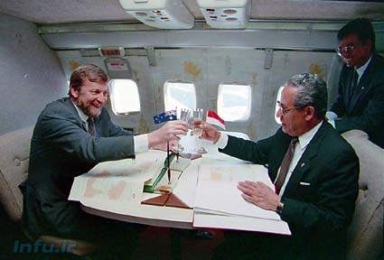 این مرد وزیر امور خارجه استرالیا, گارِت اوانز است. مرد دیگر علی آلاتاس, سخنگوی اصلی سوهارتو است. زمان سال 1989 است و این دو مسافرین پروازی سمبلیک برای جشن گرفتن معامله ای در شأن دزدان دریایی هستند که نامش را «معاهده» گذاشته اند. این معامله وسیله ای شد برای استرالیا, دیکتاتوری سوهارتو, و کمپانیهای بین المللی نفت تا منابع نفت و گاز تیمور شرقی را غارت و تقسیم کنند.