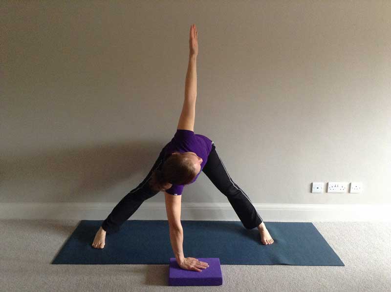 چگونه انجام می شود: پاها را از یکدیگر باز کنید و دست ها را به ارتفاع شانه ها بالا ببرید در حالیکه کف دست ها بطرف پائین است. پای چپ را ۹۰ درجه به خارج بچرخانید و پای راست را کمی بچرخانید. زانوی چپ را ۹۰ درجه خم کنید طوریکه مستقیما بر روی پاشنه باشد و بازوی راست را روی سر ببرید و سمت راست بدن خودتان را باز کنید. اگر می توانید دست چپ را روی قسمت خارجی پای چپ یا روی بلوک یوگا ببرید.نگه دارید وسپس وضعیت را عوض کنید.
