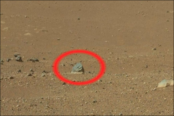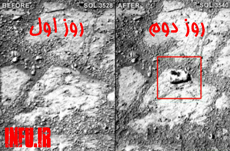 سنگ چیز غریبی در مریخ نیست و بوفور یافت می شود اما آن سنگ چرا دیروز آنجا نبوده است . ممکن است بگویید خب باد آنرا آنجا انداخته ، در حالیکه چنین نیست ، زیرا مشخصات دو تصویر کاملا مشابه هم است و هیچ چیز در دو تصویر جابجا نشده است جز آن سنگ و این نشان میدهد که بادی در کار نبوده است . باد که نبوده ، پس چه می تواند باشد ؟ انسان یا موجود دیگری هم در مریخ نیست ، شهاب سنگ هم نیست یک سنگ معمولی است.. خلاصه کلام اینکه متخصصان ناسا هر چه بررسی کردند به هیچ نتیجه ای نرسیدند.