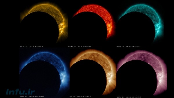 این تلسکوپ فضایی، در روز سیام ژانویه امسال، تصاویری کمنظیر از یک خورشیدگرفتگی جزئی را – که حدود دو ساعت و نیم به طول انجامید – به ثبت رساند. البته مشابه چنین پدیدهی را در همان روز و ساعت نمیشد در زمین مشاهده کرد؛ چراکه تلسکوپ SDO در مداری با فاصله ۳۶هزار کیلومتر از زمین مستقر است و راستای سایهای که ثبت کرده، در آن زمان اختلاف قابل توجهی با راستای دید ناظر زمینی داشته است. اما به لطف ابزارآلات پیشرفته و فیلترهای متنوع SDO، این تلسکوپ موفق شد این پدیده را در طول موجهای متعددی – که هرکدامشان نشان از لایهای متفاوت از سطح خورشید میدهند – به ثبت برساند. رویدادی که سالانه دو یا نهایتاً سه دفعه فرصت ثبتاش برای این تلسکوپ فراهم میشود.