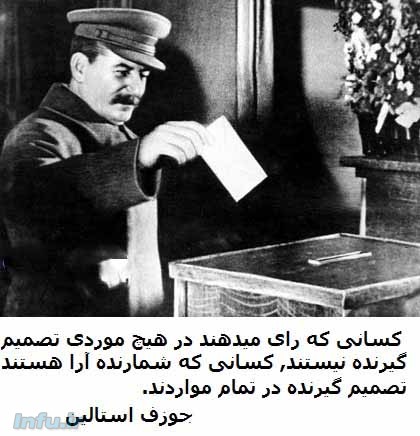 پس از جنگ جهانی دومی فرانکلین دلانو روزولت که نام واقعیش روزنفلد بود با رفیق خوبش در اتحاد جماهیر شوروی, مردی به نام یوزف استالین که نام واقعیش یوزف ویزاریونویچ جوگاشویلی بود, پسوند گاشویلی به معنای «پسرِ…» است (جوگاشویلی به معنای پسر یهودی است-مترجم), دست به یکی کردند و او به رفیقش جوگاشویلی اجازه داد بر انتخابات پیش رو در بخش بزرگی از اروپا نظارت کند. و طنز ماجرا در این است که تمام آن منتخبین مهره های پیاده در صفحه شطرنج کمونیسم شدند. استالین به وضوح گفته, و بهتر است به آنچه گفته با دقت گوش دهیم, به وضوح گفته که کسانی که رای میدهند در هیچ موردی تصمیم گیرنده نیستند, کسانی که شمارنده آرا هستند تصمیم گیرنده در تمام مواردند.