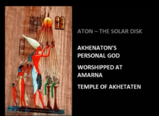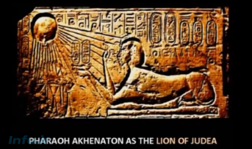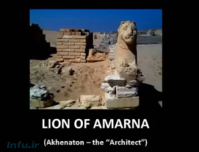 اینجا تصویری از اخناتون با ظاهر شیر دیده میشود که منشأ شیر یهودی نیز بوده است. شیر همیشه سمبل فرعون بوده است. وقتی دریابیم یهودیان و یهودیت واقعاً که بودند و چه بودند و دریابیم که منشأ آنها از مصر بوده است, بسیاری از این موارد معنا پیدا میکنند.