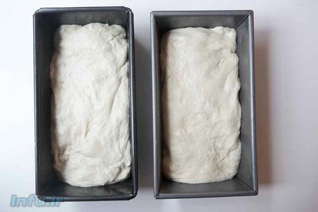 - خمیر را با دست فشار دهید. آن را روی یک سطح تمیز قرار دهید که قبلا کمی آرد روی آن پاشیدهاید. سپس خمیر را به دو قسمت تقسیم نمایید.همانند شکل دو طرف ۸ در ۴ اینچی بردارید و ته آن را با روغن زیتون چرب نمایید. هر کدام از خمیرها را به ظرف مورد نظر انتقال دهید.