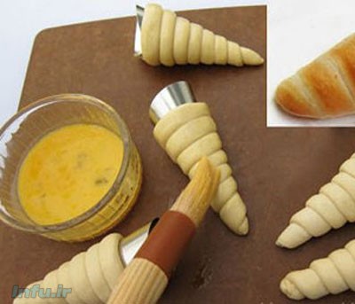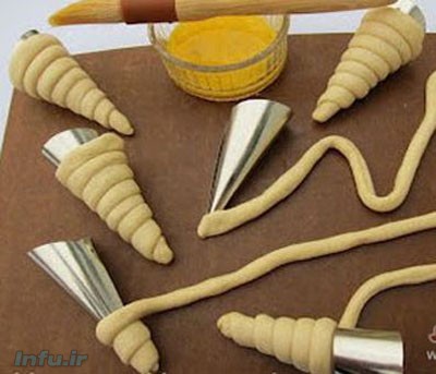 ۱) اگر قیف مخصوص در دسترستان نیست میتوانید با استفاده از فویل آلومینیوم (اگر ضخیم باشد بهتر است) قیف بسازید اگر داخل قیفها را با فویل پر کنید بهتر است زیرا دیگر هنگام پیچیدن خمیر تو رفتگی پیدا نمیکند.