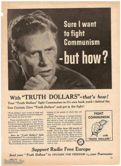 بریده نشریه با تیتر «البته که میخواهم با کمونیسم بجنگم, اما چگونه؟ با دلارهای حقیقت» برای تشویق به حمایت مالی مردم از به اصطلاح جنگ کلمات با کمونیسم
