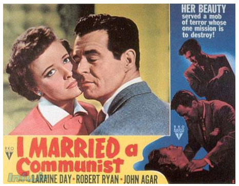 پوستر فیلم «من با یک کمونیست ازدواج کردم» با جمله تبلیغاتی: زیبایی او در خدمت تخریب یک ملت قرار گرفت
