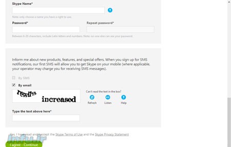 ۴ـ در بخش skype name یک نام کاربری برای خود انتخاب می کنید. سپس رمز عبور و تکرار آن را وارد می کنید. پس از آن کد امنیتی را وارد نمایید.