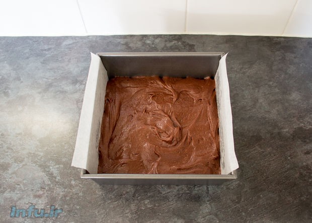 مواد را داخل قالبی که قبلا آماده کرده اید بریزید و به مدت ۲۰ تا ۲۵ دقیقه در فر قرار دهید تا بپزد. روی کیک کمی ترد و خشک می شود اما نگران نباشید چون مواد داخل کیک نرم و شکلاتی می شود.