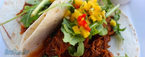 ۵٫گوشت را از فر خارج کنید و اجازه دهید ۳۰ دقیقه بماند. سپس بر روی نان تورتیلا بگذارید و با سس سرو نمایید.نوش جان