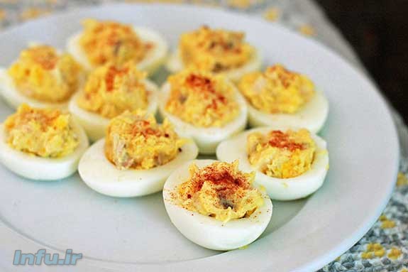 * برای پخت تخم مرغ‌ها، آن‌ها را به مدت 15 الی 20 دقیقه داخل فر با دمای 190 درجه سانتی‌گراد قرار دهید. سپس آن‌ها را بیرون بیاورید و وقتی سرد شدند، با چاقوی تیز از وسط، نصف کنید. غذا آماده سرو است