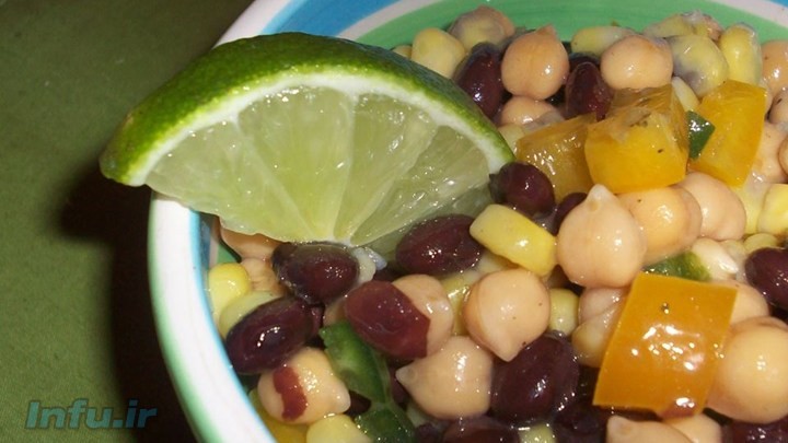 سپس در یک کاسه بزرگ نخود ، لوبیا ، ذرت ، پیاز ، گشنیز ، فلفل دلمه ، پودر فلفل ، روغن زیتون ، آب لیمو ، فلفل ، نمک و عسل را به طور کامل با هم مخلوط کنید.