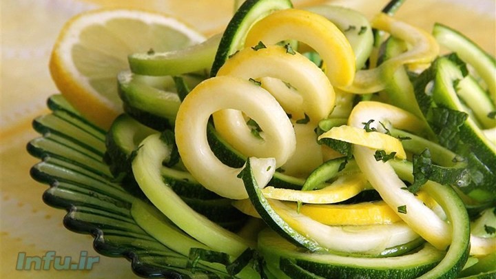 سپس کدو سبز و کدو زرد را درون یک ظرف بزرگ ریخته و آب لیمو تازه را کم کم به آن اضافه میکنیم پس از آن روغن زیتون ، نعناع و فلفل سیاه را اضافه میکنیم و به طور کامل به هم میزنیم .