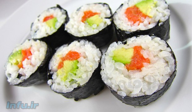اول از همه سرکه شکر و نمک رابا هم مخلوط کنید و روی حرارت قرار دهید تا شکر و نمک در سرکه حل شود.آب و برنج سوشی (یک نوع برنج گرد ژاپنی است .اگر نتوانستید این نوع برنج را پیدا کنید از برنجی ایرانی به نام حسنی میتوانید استفاده کنید که در این صورت آب ان متناسب با پخت همان برنج تنظیم میشود) را در قابلمه بریزید در آن را بگذارید و حدود ۱۲ دقیقه بجوشانید .سپس انرا از روی حرارت بردارید و آبکش کنید.(برنج گرد ژاپنی به همین شیوه پخته و نرم میشود ولی برنجهای دیگر زمان پختشان فرق میکند در هر صورت باید برنج پخته و کمی نرم شوند و حالت کته خودمان را باید داشته باشد)برنج گرم را داخل یک ظرف غیر فلزی بریزید ومخلوط سرکه را به ارامی با برنج مخلوط کنید و اگر بتوانید همزمان انرا با یک بادبزن خنک کنید برنج شما حالت شیشه ای پیدا میکند( اگر تو فصل تابستان بودید میتوانید جلوی پنکه این کار را انجام دهید)آواکادو هویج و قارچ را باریک و بلند برش دهید.حصیر مخصوص را روی سطح صافی پهن کنید(به جای حصیر مخصوص میتوانید از حصیرهای معمولی و ریزبافت که به عنوان زیز بشقابی به کار میرود استفاده کنید.)روی حصیر سلفون بکشید.برگه سوشی را به صورتی که طرف براق انزیر باشدروی سلفون قرار دهید.دستهای خود را با سرکه واب خیس کنید(سرکه را به جهت بهداشت استفاده میکنیم)و مقداری از برنج برداریدو روی برگه سوشی قرار دهید و انرا پهن کنید تمام برگه نوری را بپوشانید اما از کنارهها ۱ سانتیمتر خالی بگذارید و انتها راا همحدود ۲ سانت خالی بگذارید اگر این کار را نکنید سوشی شما در انتها به خوبی بسته نمیشود. ارتفاع برنج هم از نیم سانت کمتر باشد.حالا ابتدا از ماهی سالمون ورقه شده در بالای برنج قرار دهید و روی ان هم اواکادو هویج و قارچ را قرار دهید. سپس به کمک حصیر شروع به لوله کردن سوشی کنید و در ضمن لوله کردن فشار هم بدهید تا خوب بسته شود بعد از لوله کردن به ان شکل مربع بدهید(مانند شکل آماده)بعد از اتمام کار با یک عدد چاقوی تیز که انرا خیس کرده اید هر کدام از برگهای سوشی نوری را به ۸ قسمت مساوی تقسیم کنید.