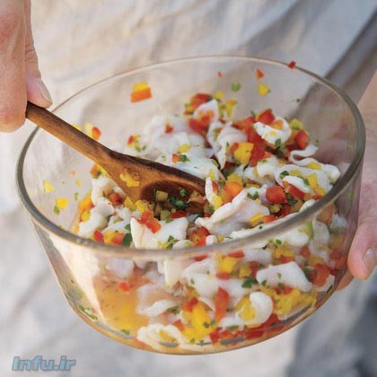 - پیازچه، سیر، گشنیز، فلفلهای دلمهای، هالاپینیو، یک چهارم قاشق چایخوری نمک، زنجبیل، آب لیمو و روغن را در یک کاسه بزرگ ترکیب کنید. صدفها را به آن اضافه کنید و خوب هم بزنید. روی آن را با کیسه پلاستیکی بپوشانید و به مدت 30 دقیقه تا 3 ساعت در یخچال بگذارید. سپس با نمک و فلفل سیاه سرو نمایید.