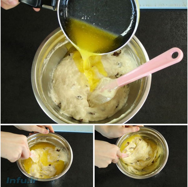 کره را آب کنید، به مواد اضافه کنید و هم بزنید.