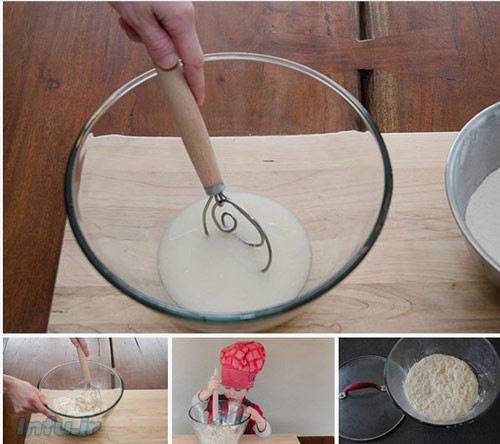 به آرامی آرد را اضافه کنید و با هم زن (یا قاشق چوبی) هم بزنید تا کاملا مواد در آب حل شود و حباب های خشک در آن باقی نماند. نتیجه خمیری آبکی به دست می آید.