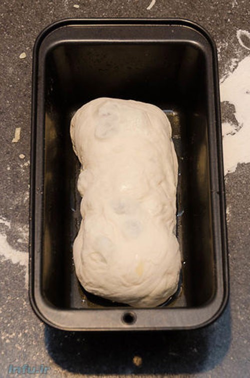 بعد از صاف کردن خمیر روی سطح زیتون (یا رزماری و پنیر به دلخواه) بریزید. کناره های نان را به سمت مرکز تا کنید و رول کنید و سر و ته خمیر را بپیچانید و کمی به زیر تا کنید تا خمیر کوچک تر از قالب شود. سپس خمیر را داخل قالب چرب شده قرار دهید، روی آن را بپوشانید و بگذارید به مدت ۴۰ دقیقه بماند.