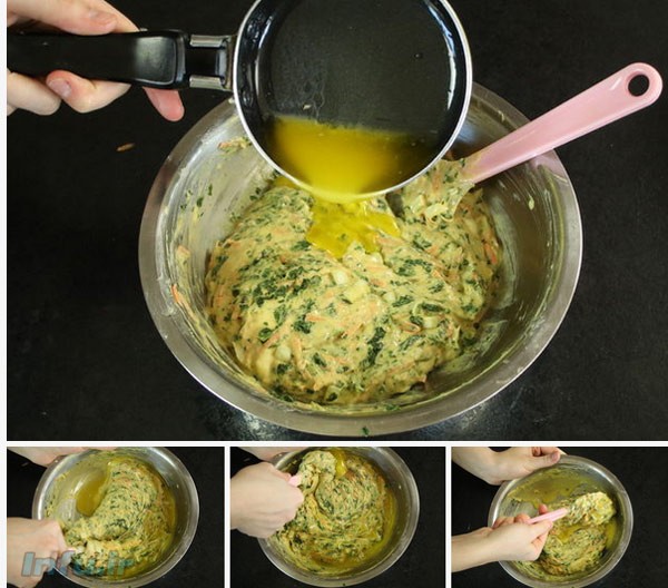 در این مرحله هویج، پیاز، اسفناج و فلفل تند را به خمیر اضافه کنید و خوب هم بزنید.