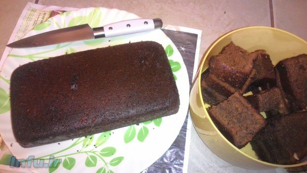 و در آخر کیک را از فر بیرون بیاورید و بگذارید به مدت ۱۰ دقیقه سرد شود سپس از قالب بیرون بیاورید.