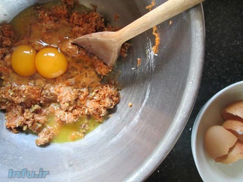 گردو، نارگیل، شکر و هویج را به مواد خشک اضافه می کنیم.