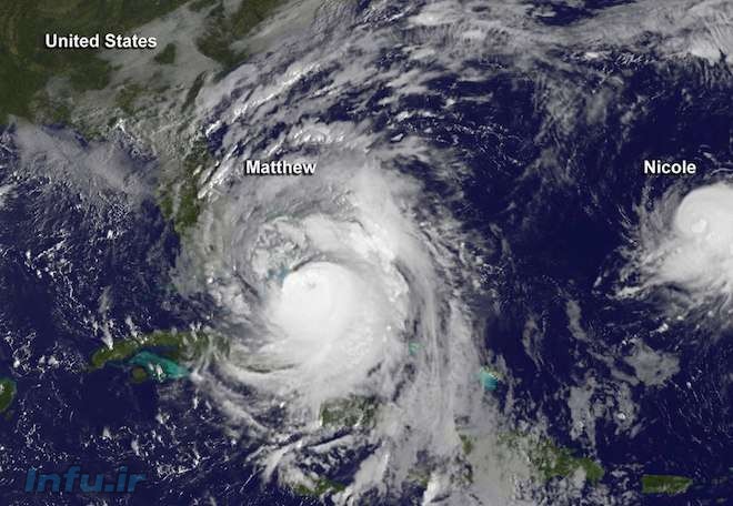 تصویر زیر که در روز ششم اکتبر ۲۰۱۶ از طوفان متیو گرفته شده، این طوفان را دو روز بعد از ارتقاء به طوفان سطح چهار نشان می دهد. در سمت راست آن طوفان بسیار کوچکترِ نیکول را نیز می توان در اقیانوس اطلس دید.