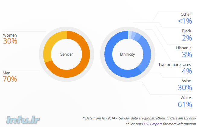 روز نهم ژوئیه ۲۰۱۴ گوگل گزارشی در مورد وضعیت توازن جنسیتی و قومی در میان کارکنان این موسسه اینترنتی- فنآوری منتشر کرد و نتیجه گرفت که «اوضاع باید بهتر شود» (گزارش کامل را اینجا بخوانید).