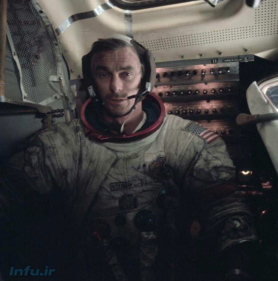 یوجین سرنان فضانورد آپولو 15 در ماه نشین پس از قدم زدن بر روی ماه،لباس های او مملو از غبار تیز و برنده ماه است.او ساعت ها تلاش کرد با جارو برقی آنرا بزداید اما نتوانست