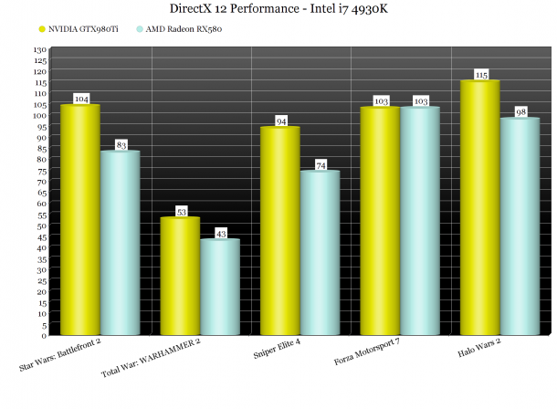 اما در بررسی بازیهای ۲۰۱۷ با Sniper Elite 4 شروع میکنیم که به تنها بازی امسال تبدیل شده است که نسخهی DX12 آن از نسخهی DX11 آن برروی کارتهای گرافیک AMD عملکرد بهتری داشته است. در نظر داشته باشید که دو بازی Forza Motorsport 7 و Halo Wars 2 تنها از DX12 پشتیبانی میکنند؛ بنابراین نمیتوان عملکرد این دو بازی برروی DX11 را مورد بررسی قرار داد. از طرف دیگر عناوین Total War: Warhammer 2 و Battlefront II با استفاده از DX11 سرعت بهتری را نسبت به نسخهی DX12 خود ارائه میدهند. این موضوع چندان غافلگیرکننده نیست؛ زیرا سال پیش هم بازیهای Warhammer 1 و Battlefield 1 دقیقا همین وضعیت را داشتند.