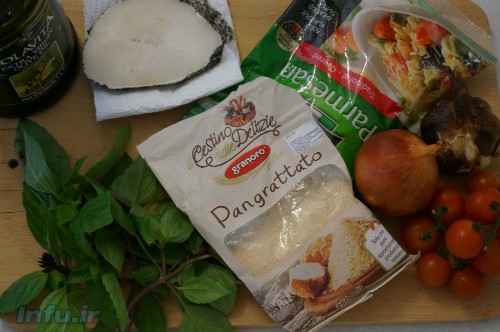 احتمالا یک عدد پیاز متوسط و یک حبه سیر را در خانه دارید. ولی بعید میدانم ۱۵۰ گرم فیله ماهی (من از کاد فیش استفاده کردم، شما میتوانید از فیله هر ماهی بدون استخوانی استفاده کنید)، ۶ عدد گوجه کوچک (Cherry tomato) یا یک عدد گوجه معمولی، ۵۰ گرم ریحان، پنیر پارمزان و پودرسوخاری را داشته باشید. شاید هم بعضیهایش را داشته باشید. به هر حالمن منتظر میمانم تا خرید کنید و برگردید.