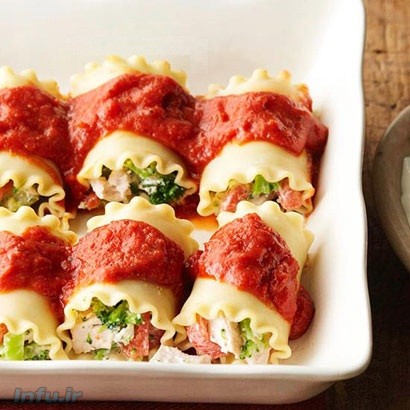 ۴ – یک فنجان سس مارینا را را بر روی لازانیاهای رول شده بریزید . روی ظرف را با فویل آلومینیومی بپوشانید و آن را بمدت ۳۵ تا ۴۰ دقیقه در فری که با دمای ۳۵۰ درجه فارنهایت گرم شده است قرار دهید .