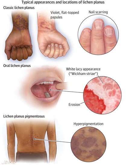 بیماری های دیگری هم همراه با لیکن پلان دیده می شوند مثل کچلی سکه ای، مرض قند، کولیت اولسروز و …